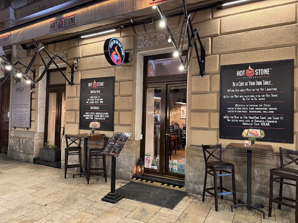 A Hot Stone Steakhouse Budapest szívében valóban egyedi étkezési élményt kínál, ahol a vendégek saját maguk készíthetik el steakeiket forró kövön. A húsok minősége kiváló, a steakek tökéletesen sütöttek, és a hely hangulata meleg, barátságos, ideális egy kellemes vacsorához. A pincérek, mint Vivien és Ákos, figyelmesek és segítőkészek, akik minden kérésre gyorsan reagálnak, és igyekeznek, hogy az étkezés valódi élményt nyújtson. Az étterem családbarát, és a szolgáltatás általában gyors és professzionális.
